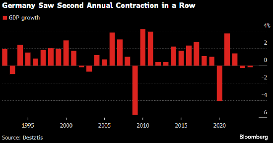 2024年,主要受到陷入困境的制造业拖累的德国经济已经连续第二年萎缩,2025年可能再次萎缩。