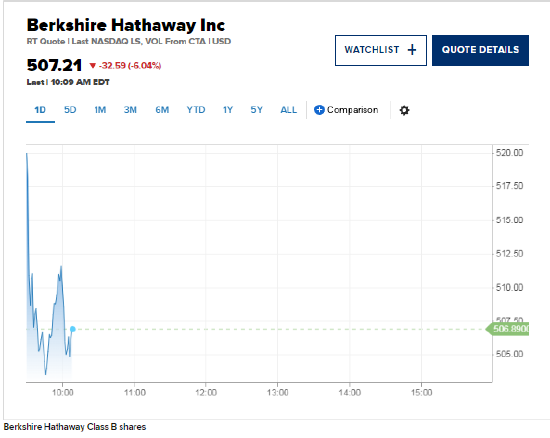 该公司的 A 股股价在周五以每股 809,350 美元的创纪录高价收盘后,下跌了 6.2%,至约 760,000 美元。B 股股价在周五触及 539.80 美元的历史高点后,下跌了 6.2%,至 506.12 美元。伯克希尔于 1996 年发行 B 股,其价格相当于 A 股的三十分之一。2010 年,伯克希尔的 B 股进行了 1 股拆 50 股的拆分。