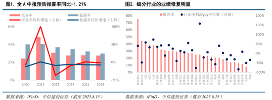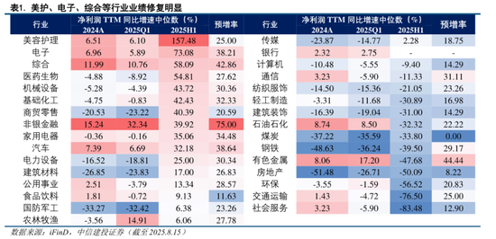 全A盈利复苏并不显著,主要的盈利推力在于结构性景气。截至2025年8月15日,A股5,313家上市公司中(剔除上市一年之内的公司),共1,581家发布2025年中期报告业绩预告,披露率为29.76%,预增率为27.51%,同比-1.21%,整体盈利复苏并不明显。然而大量细分产业的业绩修复及产业动态变化却给出不少惊喜,如美护、电子、非银、有色等,因此自下而上的投资者对特定产业景气复苏信心很高。