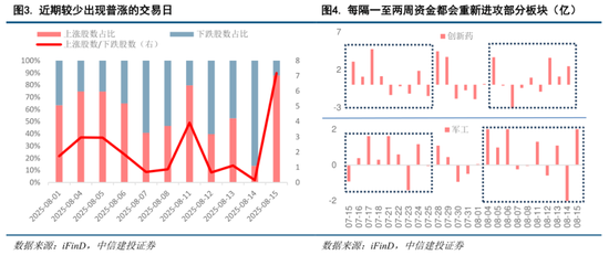 此外,基于结构性板块业绩修复,我们发现近期很少出现普涨的交易日,但是每隔一两周资金会重新进攻部分景气板块。8月以来,很少出现上涨股数达85%以上的交易日,上涨股数占总股数比例的中位数为58%,较少出现普涨的交易日。然而,我们发现每隔一两周资金会重新涌入部分景气板块。