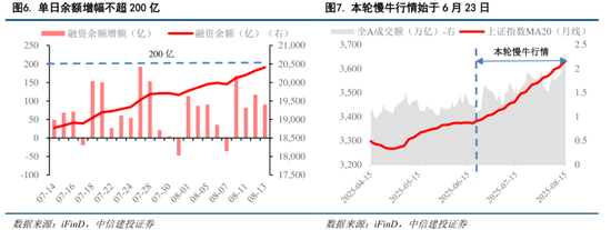市场做多方向明确但节奏相对稳健。本轮慢牛行情始于6月23日,直接催化是中东地缘冲突的缓解,此前压制市场的利空结束,伴随市场回归上涨下,融资余额不断增加的同时单日增幅不超过200亿,远远小于此前快速上涨期间的融资余额情况。
