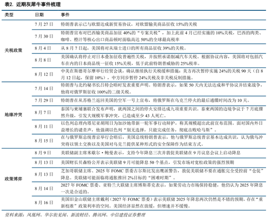 (1)灰犀牛事件近期普遍降温,利空隐患不显著。当前主要灰犀牛事件主要由美国关税政策,地缘热点冲突和美联储货币政策博弈三部分构成,目前风险普遍受控于预期之内。关税方面,随着8月初美国新一轮全球关税谈判及实行基本落定,8月12日中美斯德哥尔摩经贸会谈,确认继续执行关税缓和措施中美关税90天;地缘冲突方面,泰柬边境冲突于8月7日迅速停火,美俄8月15日会谈达成俄乌冲突将以领土交换以及美国对乌克兰提供某种形式的安全保障作为结束方式的共识;政策博弈方面,美联储及美国政府的货币政策博弈白热化阶段已过,年内至少降息一至两次已成基本预期。