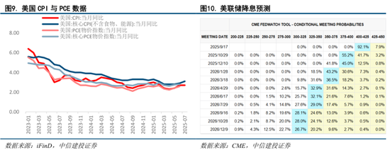 (2)非农数据爆冷下修,美国降息预期抬升。就业方面,8月1日美国劳工统计局(BLS)最新发布数据,7月新增非农就业仅7.3万人,创近9个月最低,失业率小幅升至4.2%。此外5-6月新增非农就业人数分别从13.9万人、14.7万人下修至1.9万人、1.4万人,非农数据爆冷且前值罕见大幅下修;物价方面,呈现通胀压力温和态势,美国7月CPI同比+2.7%,低于市场预期的2.8%。核心CPI创5个月新高,同比+3.1%,高于预期的3.0%。数据发布后,美联储9月降息预测概率高达92.1%,10月再次降息概率达55.2%,年内或有2-3次降息。