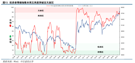 情绪指标显示局部过热但尚未达到显著全面过热。我们构建并持续跟踪的A股投资者情绪指数本周五再度向上突破了90进入亢奋区,市场短期可能出现加速冲顶的走势。如果后续市场确实出现加速冲顶,市场可能因为过热而出现较大幅度的调整。