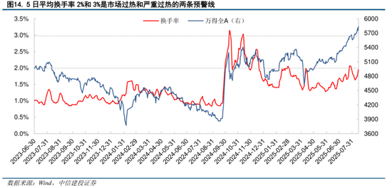 5日平均换手率水平示警,关注市场走势及过热信号。一个提示市场过热的关键情绪分项指标是5日平均换手率水平,历史上该指标超过2%后几天内市场往往因为过热而回调,更激烈的行情中该指标可能超过3%并在随后引发更大幅度的调整。近三个交易日市场量能明显放大,推动5日平均换手率水平周五达到1.95%,已经接近2%预警线。建议关注下周市场走势和相应的过热信号发出。