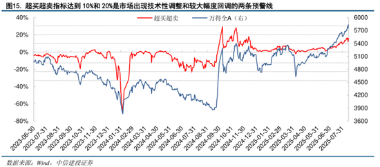 另一个关键情绪分项指标是反映市场短期强弱势水平的超买超卖。该指标4月中旬以来一直处于零轴上方,显示市场持续处于较为强势的状态。该指标距离零轴越远说明市场反转回调的压力越大。目前该指标已经接近16%,超过10%说明市场面临一定的技术性调整压力,但该指标尚未达到20%的水平。从历史上看,该指标达到20%或30%后,市场调整的幅度和时间都相对更大更长。
