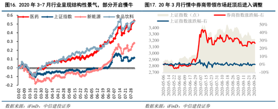 1)加速赶顶后交易过热:参考2020年3-7月行情,前期因疫情带来的不确定性市场对于宏观经济预期不高,上证指数徘徊于2900点附近,但行业呈现结构性景气(半导体、医药、免税等)并开始产生慢牛。6月中旬开始,券商板块带领市场加速赶顶(6.19-7.14券商板块平均涨幅为23%,最大涨幅为43%),随后市场进入中期调整。