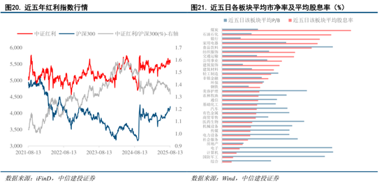 低利率格局或于中长期维持,红利板块高股息率溢价凸显。近期债市受政策面转向财政贴息影响,10年期国债收益率回升至1.74%,但短期来看低利率环境仍难以改变。在此背景下,红利资产的股息率溢价凸显。同时,当前红利板块的市净率仍处于相对低位,在高股息率及低波动率的加持下该板块可作为辅助配置。
