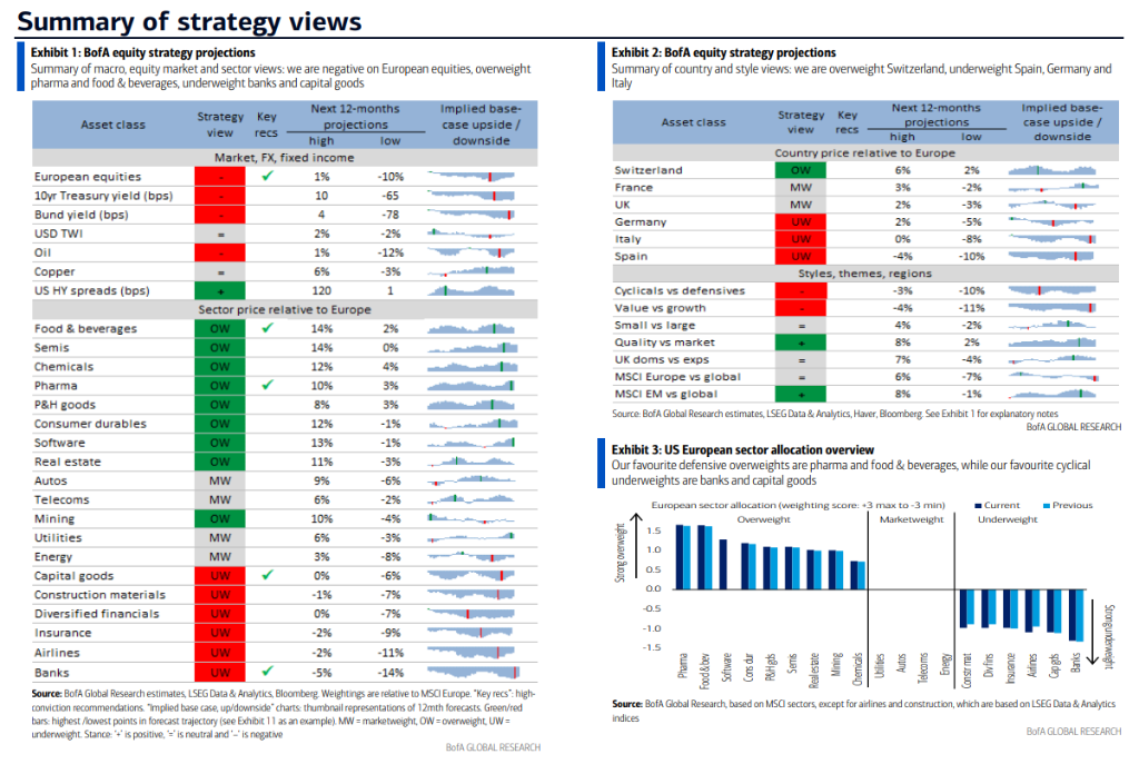 美银对欧洲周期性行业相对防御性行业持低配立场,看好医药和食品饮料板块,看空银行和资本品。