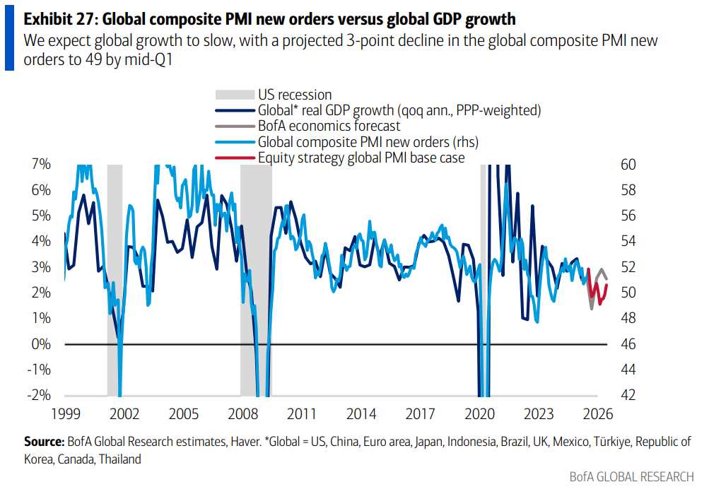 美银预计,全球宏观阻力将导致全球综合PMI新订单从当前52点下降至明年第一季度的49点,这意味着风险溢价上升和EPS预期下调,由此对市场造成的拖累只能部分被无风险贴现率下降所抵消。