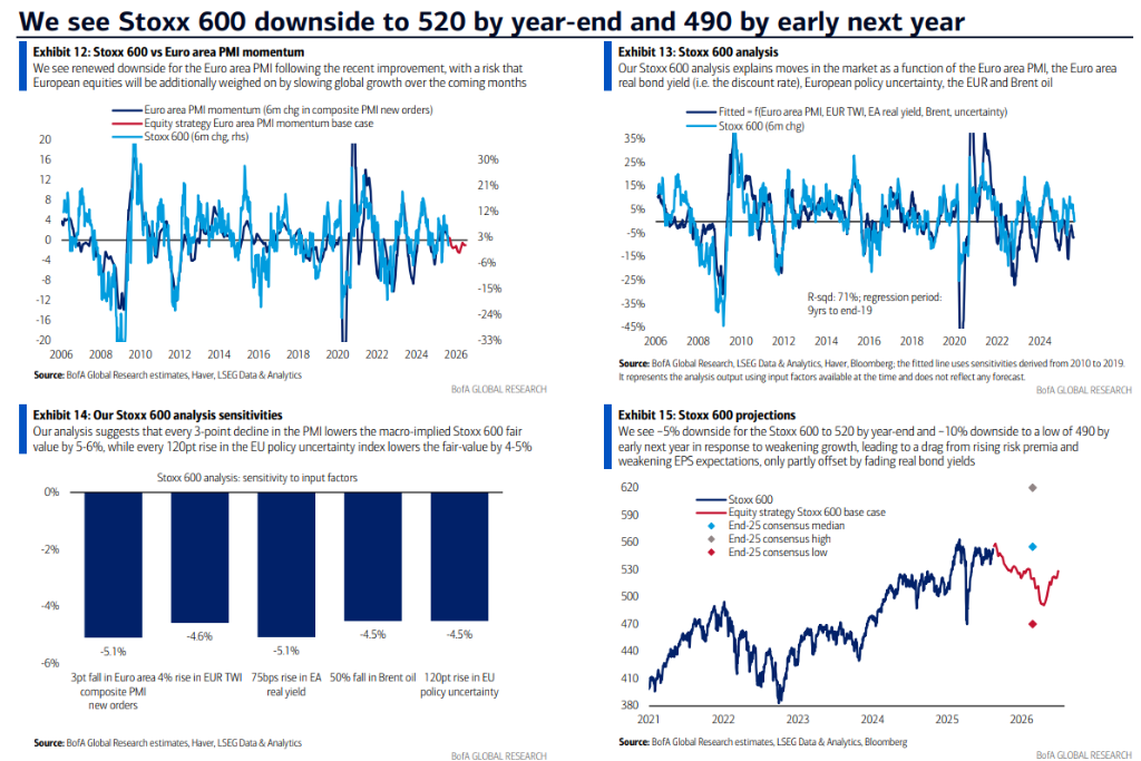 因此,尽管实际债券收益率下降本身对欧洲股市有利,但美银分析师认为,在经济增长放缓的情况下,债券收益率下降将转化为盈利预期下调和估值倍数下降,导致股市下跌。