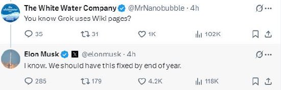一位网友在这条帖子下问道:“你知道Grok使用维基页面吗?”