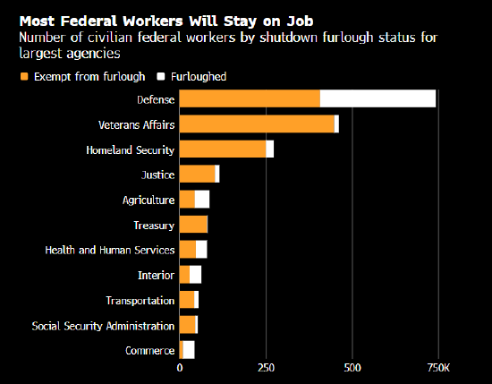 因此,预计这次关门中不到三分之一的联邦雇员会被迫休假,低于以往约40%的水平。