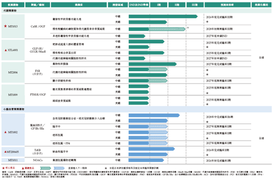 一款核心产品MT1013,是全球首创的双靶点受体激动剂多肽药物,可同时靶向CaSR及OGP受体,其主要适应症为继发性甲状旁腺功能亢进(SHPT),并具备潜力可扩展至慢性肾脏病的矿物质和骨代谢异常(CKD-MBD)伴骨质疏松以及未接受透析的SHPT等额外适应症; 截至最后实际可行日期,MT1013已于2025 年5月完成其用于治疗SHPT的II期临床试验(MT1013-II-C01),并已进入一项使用西那卡塞作为阳性对照药物的III期临床试验。