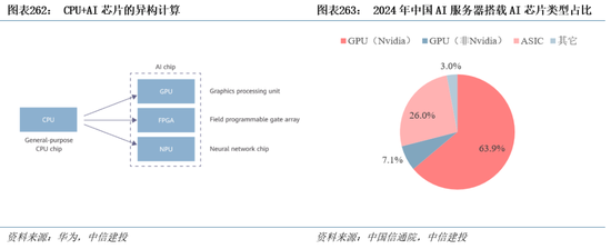 CPU+XPU的异构方案成为大算力场景标配,GPU为应用最广泛的AI芯片。目前业内广泛认同的AI芯片类型包括GPU、FPGA、NPU等。由于CPU负责对计算机的硬件资源进行控制调配,也要负责操作系统的运行,在现代计算系统中仍不可或缺。GPU、FPGA等芯片都是作为CPU的加速器而存在,因此目前主流的AI计算系统均为CPU+XPU的异构并行。CPU+GPU是目前最流行的异构计算系统,在HPC、图形图像处理以及AI训练/推理等场景为主流选择。根据中国信通院《先进计算蓝皮书》,2024年,搭载GPU的AI服务器占比约为71%,其中英伟达的市场占有率接近90%,AMD约为8%;随着全球领先的云服务商不断加大对自研芯片的应用力度,非GPU的AI芯片市场规模显著增长,其中ASIC芯片在AI服务器中的占比已攀升至26%。