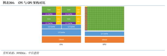 GPU能够进行并行计算,设计初衷是加速图形渲染。NVIDIA在1999年发布GeForce 256图形处理芯片时首先提出GPU(Graphics Processing Unit)的概念,并将其定义为“具有集成转换、照明、三角形设置/裁剪和渲染引擎的单芯片处理器,每秒能够处理至少1000万个多边形”。从计算资源占比角度看,CPU包含大量的控制单元和缓存单元,实际运算单元占比较小。GPU则使用大量的运算单元,少量的控制单元和缓存单元。GPU的架构使其能够进行规模化并行计算,尤其适合逻辑简单,运算量大的任务。GPU通过从CPU承担一些计算密集型功能(例如渲染)来提高计算机性能,加快应用程序的处理速度,这也是GPU早期的功能定位。