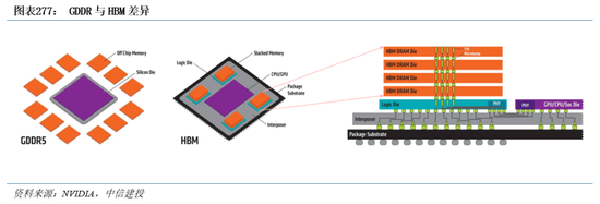 GPU采用高带宽HBM以降低“内存墙”影响。为防止占用系统内存并提供较高的带宽和较低的延时,GPU均配备有独立的内存。常规的GDDR焊接在GPU芯片周边的PCB板上,与处理器之间的数据传输速率慢,并且存储容量小,成为运算速度提升的瓶颈。HBM裸片通过TSV进行堆叠,然后HBM整体与GPU核心通过中介层互连,因此HBM获得了极高的带宽,并节省了PCB面积。目前,GDDR显存仍是消费级GPU的行业标准,HBM则成为数据中心GPU的主流选择。