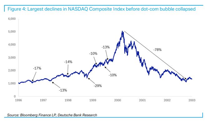 德银援引互联网泡沫为例,纳斯达克在2000年3月10日见顶前的5年间,曾7次出现10%以上的大幅回调。更重要的是,在泡沫讨论变得普遍后,市场仍可能持续上涨很长时间。