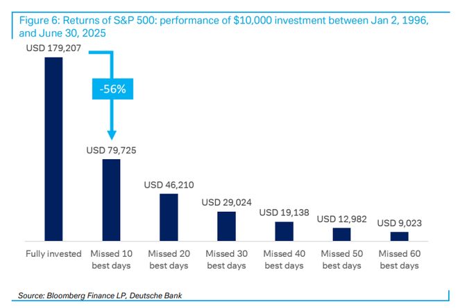 德银的核心建议是避免试图择时。该行数据显示,如果1996年初投资1万美元并持有至今年6月,价值将超过17万美元。但如果错过最佳的10个交易日,回报将减半;错过最佳20个交易日,回报仅为四分之一。