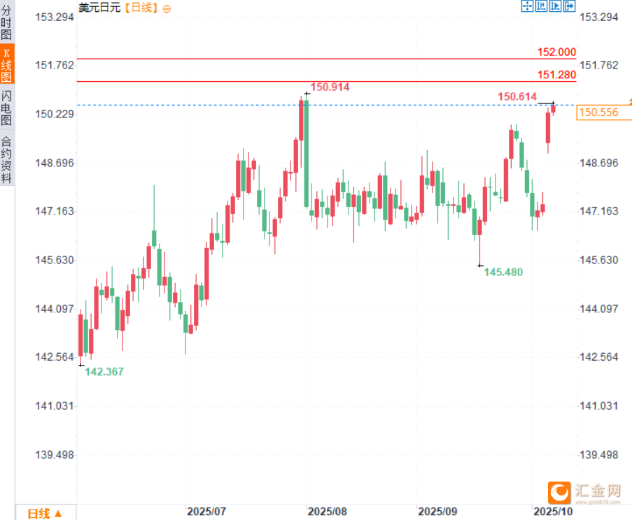 周二(10月7日),美元/日元延续涨势,一度达150.61的两个月高点。因东京政治变动导致日元大幅抛售。有报道称支持经济刺激的候选人和日本央行加息的公开批评者高市早苗有望成为日本首位女首相,市场对此作出反应,引发日元普遍下跌,并重新激发对利差交易的兴趣。