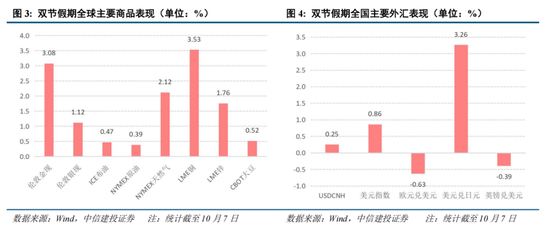 双节假期主要商品价格普遍上涨,其中LME铜价上涨3.53%,伦敦金现和NYME天然气涨幅分别达到3.08%和2.12%,在美国政府关门和OPEC增产背景下,国际油价涨幅最少。