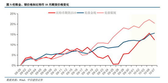 金银等贵金属和加密货币在国庆中秋假期迎来大涨,伦敦金现、伦敦银现和比特币10月期货价格在10月1日至7日分别上涨3.08%、1.12%和6.55%,LME铜价也上涨了3.53%。国际金价大涨的背后主要是由美国政府停摆引发的短期波动、日本政治更迭带来的短期不确定性、美联储持续降息预期和全球央行持续购金共同推动的。