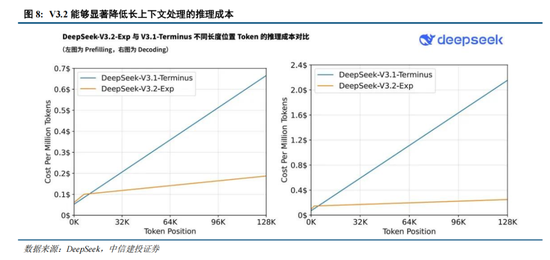 在预填充(prefilling)阶段与解码(decoding)阶段,V3.2相比于V3.1在短序列处理方面的成本会略高,而随着处理的序列长度的增加,其成本增加的速率反而大幅放缓。总的来说,V3.2-Exp在长序列处理方面表现更好,这对于处理长文档、长对话等场景非常有利,能够显著降低长上下文处理的推理成本。