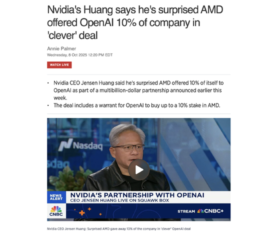看起来,这一交易结构是苏姿丰精心设计的。黄仁勋真的没有想到外甥女会玩这么一招。他今天接受美国媒体采访时表示,他对AMD向OpenAI提供10%认股权证的结构感到吃惊。