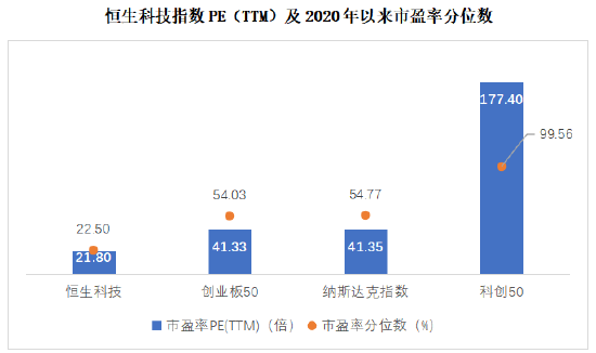 目前,恒生科技指数PE(TTM)为21.80倍,处于2020年以来22.50%的较低分位水平,显著低于创业板50、科创50等A股科技指数,也低于纳斯达克指数等美股科技类资产。