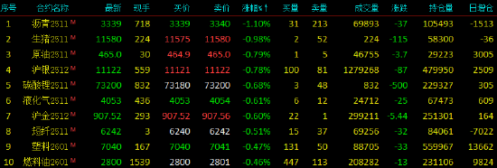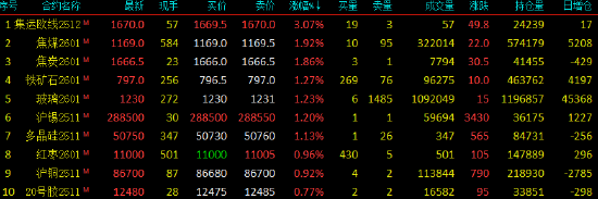 2025年10月10日,早盘开盘,国内期货主力合约涨多跌少。集运欧线涨超3%,焦煤、焦炭涨近2%,铁矿、玻璃、沪锡、多晶硅涨超1%,沪铜涨近1%;跌幅方面,SC原油、沥青跌近1%。