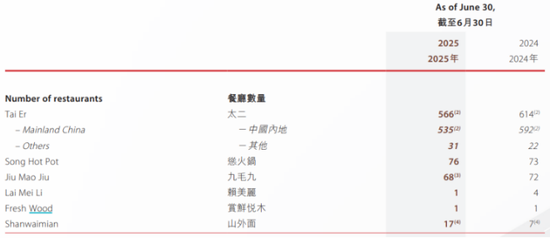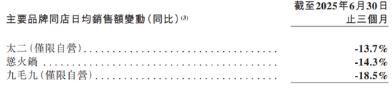 今年上半年,太二经营指标仍不理想,直营店的翻台率由上年同期的3.8次/天下降至3.1次/天,同店销售额同比下降19%。与此同时,太二扩张节奏自2024年起显著放缓,2023年、2024年,太二门店规模分别净增长128间、56间,今年上半年的门店数量则净减少65间,九毛九解释称,太二上半年收入承压与其报告期内门店规模大幅缩减以及同店销售不振有关。