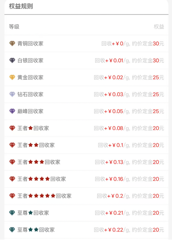 与订购相比,约价回收的定金机制更加复杂。根据回收级别不同,该平台设置的每克约价金额在20元~30元不等。不过,10月初,该平台改变规则,寄卖通仅做回收业务。