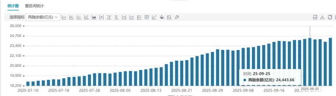 8月以来,两融市场热度持续火热。9月以后,A股两融余额始终保持在2.2万亿元之上,并在9月25日进一步增至2.44万亿元,刷新近三年新高。