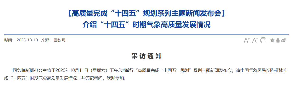 国务院新闻办公室将于2025年10月11日(星期六)下午3时举行“高质量完成‘十四五’规划”系列主题新闻发布会,请中国气象局局长陈振林介绍“十四五”时期气象高质量发展情况,并答记者问。>>点击观看