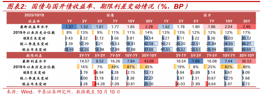 1)利率债长端回调幅度大于短端,曲线走陡,长端利差走阔,5Y-3Y利差收窄。截至10月10日(下同),30Y国债收益率较8月末调整14.5BP,1Y国债收益率基本不变,同期30Y-10Y国债期限利差回至2019年以来45%历史分位数,利差走阔至44BP左右。