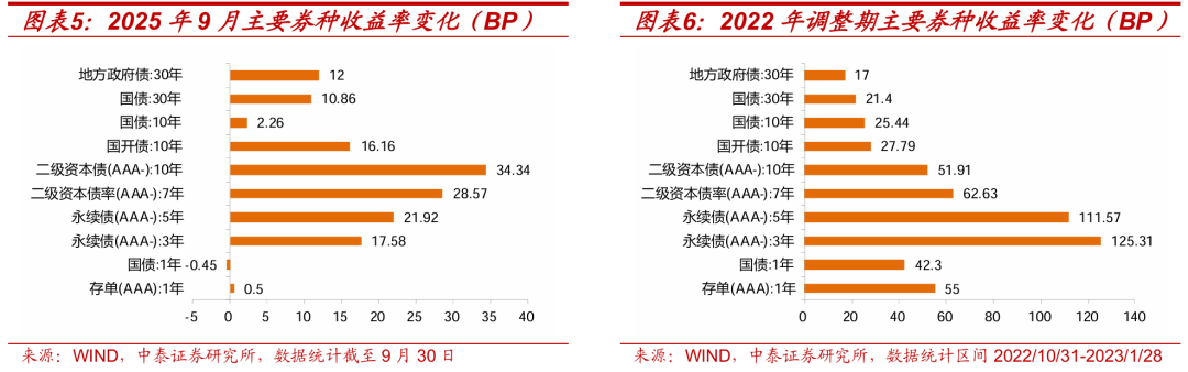 与22年四季度的调整相比,均表现出二永领跌特征,但本轮“杀基金重仓债”行情中短端跌幅不大,曲线走陡更为显著。尤其9月以来,关键期限二永债回调幅度较大,7Y、10Y二级债领跌30BP左右,3Y、5Y永续债调整幅度也在20BP左右;利率债调整中,超长期限品种调整幅度居前,9月以来10Y国开跌幅达16BP表现居前,30Y国债跌幅达11BP。