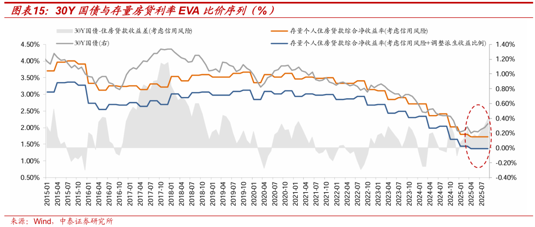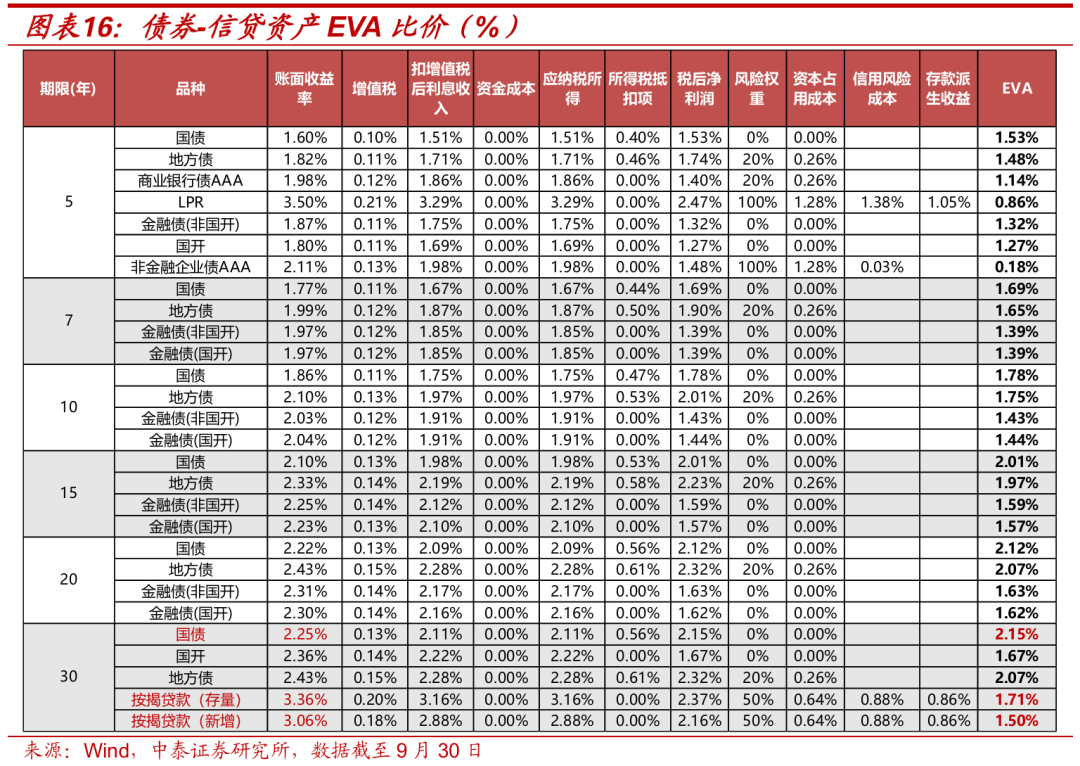 EVA比价视角:30Y较房贷比价优势回归,10Y相对中性。如果回到银行视角EVA测算来看:截至9月末30Y国债税后EVA水平为2.15%,即便是考虑利息收入增值税的恢复,相较存量房贷利率的1.71%已经具有较高的比价优势,二者利差走阔至2015年以来79%历史分位数;但10Y国债品种相较一般贷款的EVA利差水平仅回升至24%历史分位数水平,比价优势较为中性。