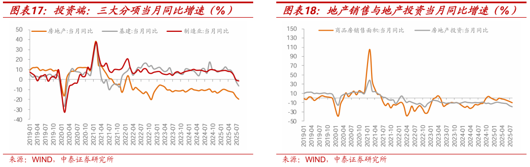 伴随设备更新支撑减弱和“反内卷”政策影响开始显现,制造业当月同比增速转负,基建投资也表现退坡,主要受公用事业拖累影响;以旧换新补贴前置发力,后发拉动乏力,补贴类商品增速回落,但服务消费形成支撑;