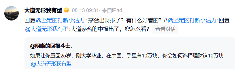 对于半年报,段永平8月13日回应网友提问时表示,“茅台出财报了?有什么好看的?”