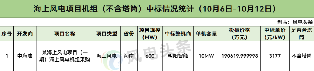 据风电头条统计,10月6日-10月12日风电整机采购开标总计1242MW,风电机组招标总计505MW;风电塔筒开标总计1000MW。