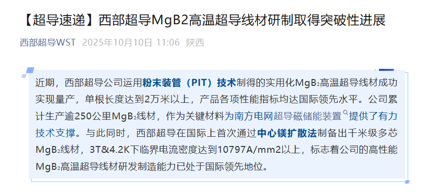 西部超导10月10日在官方公众号“西部超导WST”上发布消息,表示近期公司运用粉末装管(PIT)技术制得的实用化MgB 高温超导线材成功实现量产,单根长度达到2万米以上,产品各项性能指标均达国际领先水平。公司累计生产逾250公里MgB 线材,作为关键材料为南方电网超导磁储能装置提供了有力技术支撑。与此同时,西部超导在国际上首次通过中心镁扩散法制备出千米级多芯MgB 线材,3T4.2K下临界电流密度达到10797A/mm2以上,标志着公司的高性能MgB 高温超导线材研发制造能力已处于国际领先地位。