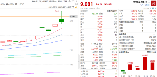 黄金今日再创新高,COMEX黄金在10月9日小幅回调后,强势站上4200美元/盎司。黄金基金ETF(518800)今日上涨2.45%,位居市场前列。我们对黄金的中期逻辑仍然看好,建议投资者关注黄金基金ETF(518800)。
