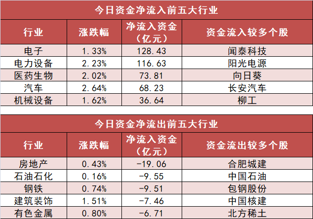申万一级行业中,20个行业实现资金净流入,其中电子行业净流入128.43亿元居首。