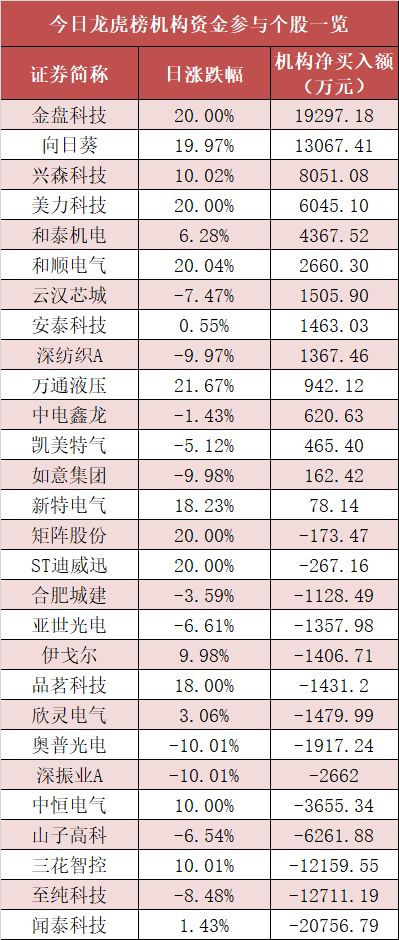盘后龙虎榜数据显示,机构现身多股,其中金盘科技等股票呈现机构资金净买入,闻泰科技(维权)等股票呈现机构资金净卖出。