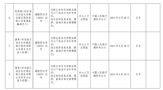 同时,该行多名员工也受到处罚。时任浙江安吉农商行章村支行客户经理饶某、运营管理部总经理彭某,分别被处以1万元罚款;时任开发区支行客户经理金某、余村绿色支行客户经理彭某飞、开发区支行客户经理张某闪、城中支行客户经理陈某、普惠金融部员工张某胜、孝丰支行客户经理游某、灵芝支行客户经理谢某、城中支行客户经理储某,分别被处以0.5-1万元罚款。