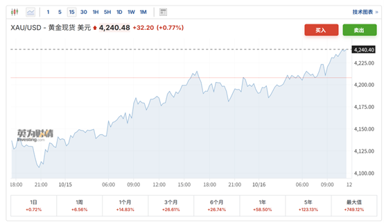 国际金价今年以来一路狂飙。周四早盘,现货黄金站上4240美元/盎司,连续4个交易日创下新高,年内涨幅超60%。而纽约期金突破4250美元/盎司,日内涨幅达1.2%。