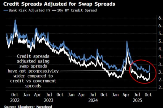 至少此前它们开始显得更安全。近期在贸易紧张局势再起,以及First Brands破产之后,利差已经走阔。正如摩根大通首席执行官杰米·戴蒙提醒我们的那样,如果你看到一只蟑螂,就很可能还会看到别的。