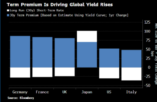 对官方抵押品信心的减弱,可以从期限溢价的上升中看出端倪。在多数主要发达市场国家,期限溢价推动了过去一年收益率的上行。