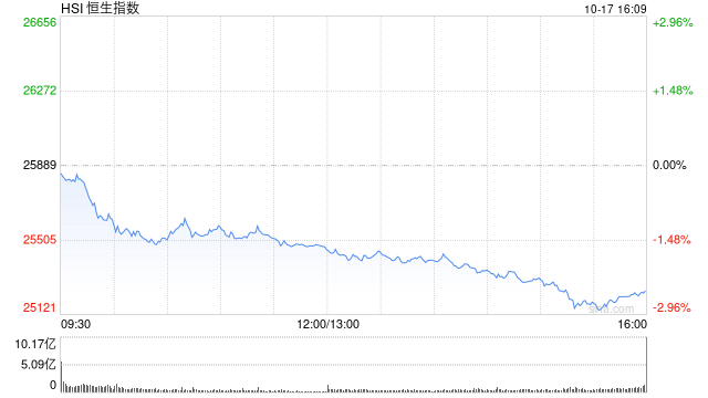 10月17日消息,港股三大指数集体下挫。截至收盘,恒生指数跌2.48%,报25247.10点,恒生科技指数跌4.05%,国企指数跌2.67%。盘面上,科网股全线下跌,百度、阿里巴巴、美团、快手跌超4%,网易、小米、联想、哔哩哔哩、京东跌超3%,腾讯跌超1%;芯片股大跌,中兴通讯跌超12%;苹果概念跌幅居前,鸿腾精密跌超10%;电力设备股走弱,哈尔滨电气跌超9%。
