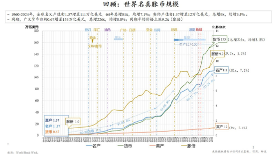 这页数据涵盖1960年-2024年全世界的经济总量,这是系统性的概括。通常有名义产值、真实产值、通胀。产值是一个国家经济发展活动的期间变动总量,货币是当期对应的发行货币总量,是存量数据代表。从图上可看到,总体世界在发展在进步。